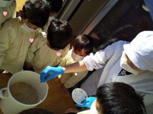 今回はばら組(4歳児クラス)の「味噌づくり」の様子をお届けします・・・♪