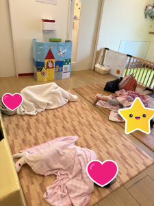 お迎えを待っている時に、子どもたちが安心して横に慣れたのは普段から使っているマットでした。