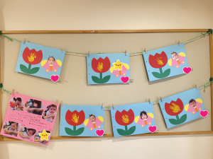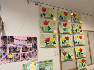 廊下に掲示しているので、保護者の方と嬉しそうに話している姿がとても可愛らしいです💛