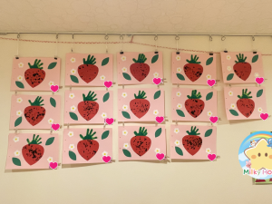 「いちご」・・・手形をとって、指スタンプでいちごの種を描きました✨