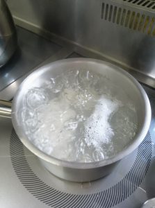 ③丸くなったお団子は栄養士の先生に給食室でゆでてもらいます。