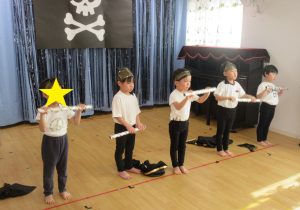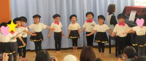初めて音楽を流した時から、「この歌かわいい!」「おおかみだぞー!」と大興奮の子どもたち。曲の歌詞に合わせた振付を子どもたちと一緒に考えながら活動し、当日も緊張に負けず元気に披露することが出来ました🐷