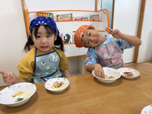 最初は、少しずつ乗せていた皆。でも、途中から山盛りに乗せていました。また、「かおをつくる~」と、具材を使って顔作りをしているお友だちもいました。