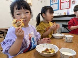 出来上がるのが待ち遠しかった皆。お昼ご飯の時にピザがないと少しさびしそうに‥・。