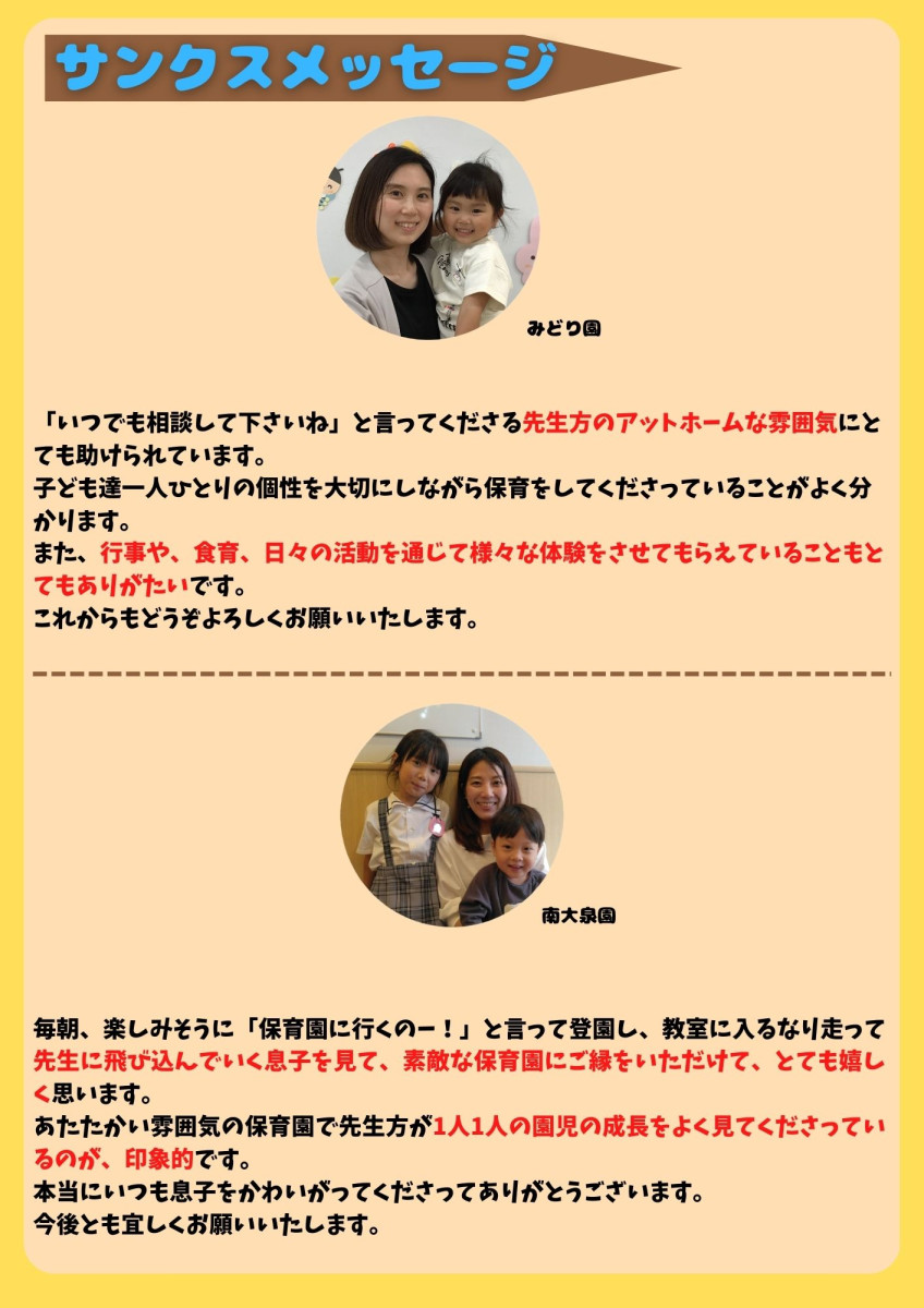 また、行事や、食育、日々の活動を通じて様々な体験をさせてもらえていることもとてもありがたいです。