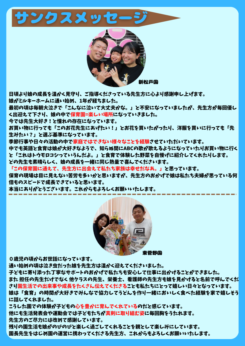 「この保育園に通えて、先生方に出会えて私たち家族は幸せだなあ。」と思っています。