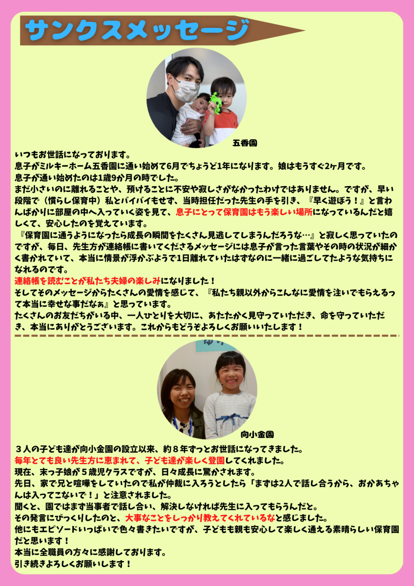 たくさんのお友だちがいる中、一人ひとりを大切に、あたたかく見守っていただき、命を守っていただき、本当にありがとうございます。これからもどうぞよろしくお願いいたします!