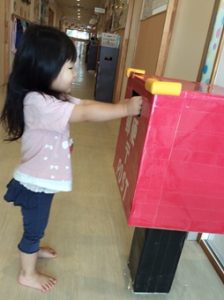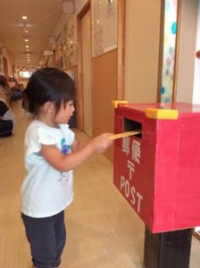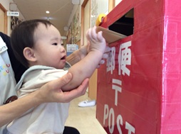 0,1,2歳児のお友だちは、玄関の前にできた「手作りポスト」に、お手紙をひとりずつポストに入れる「投函ごっこ」を楽しみました。