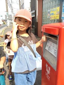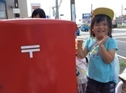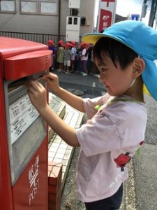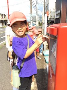 3,4,5歳児のお友だちは、ポストに投函するため、みんなで歩いて近くの郵便局まで行きました。