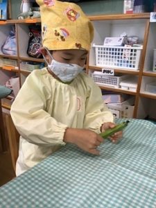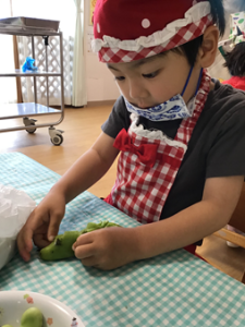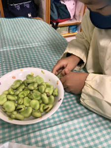 5月の食育は「そら豆のさやとり」です。