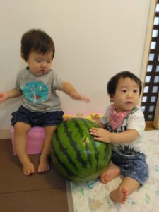 パッカ~ンとスイカが割れると、ニッコリ笑顔やビックリ顔の子どもたち♪