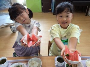 本日の給食のデザートはスイカ♪(スイカ割りで使用したスイカではございません)