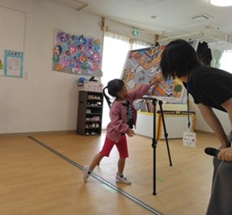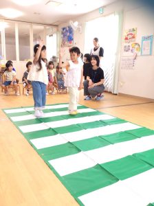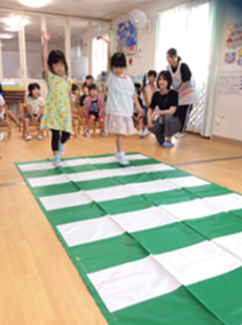 警察署の方や、市役所の方が準備をしている様子を見てちょっぴりドキドキした様子の子どもたちでしたが、はじめのご挨拶をしたり警察官の方と「落~ちた落ちたゲーム」をしたりして、和やかな雰囲気の中教室が始まりました。